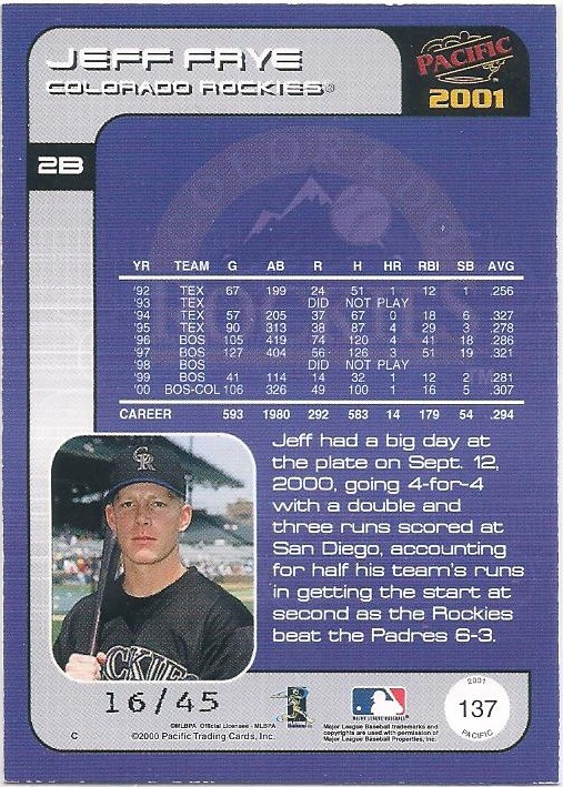 Jeff Frye – 2001 Issues 1999 Gallery 2002 2001 MLB Showdown Unlimited 2001 MLB Showdown 1st Edition 2001 MLB Showdown 1st Edition 2001 MLB Showdown 2001 Oh Henry! 2001 Oh Henry! 2001 Pacific 2001 Pacific 2001 Pacific Extreme LTD 2001 Pacific Extreme LTD 2001 Pacific Hobby LTD 2001 Pacific Hobby LTD 2001 Pacific Premier Date 2001 Pacific Premiere Date 2001 Pacific Retail LTD 2001 Pacific Retail LTD 2001 Pacific Private Stock 2001 Pacific Private Stock Back 2001 Topps 2001 Topps 2001 Topps Employee 2001 Topps Home Team Advantage 2001 Topps Limited Edition 2001 Topps Parallel 2001 Topps National 1 of 1 2001 Topps National 1 of 1 2001 Topps Gold 2001 Topps Gold 2001 Topps Traded 2001 Topps Traded 2001 Topps Traded Gold 2001 Topps Traded Gold 2001 Topps Chrome Traded 2001 Topps Chrome Traded 2001 Topps Chrome Traded Retrofractor 2001 Topps Chrome Traded Retrofractor Share this: Share on X (Opens in new window) X Share on Facebook (Opens in new window) Facebook Like Loading...